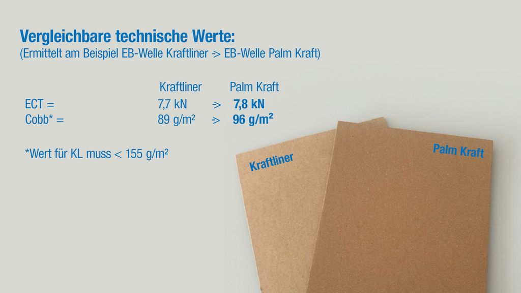 - Umstellung von Kraftliner weiß außen und Testliner innen → auf Testliner weiß außen und Palm Kraft innen ohne Verlust der technischen Anforderungen